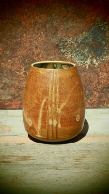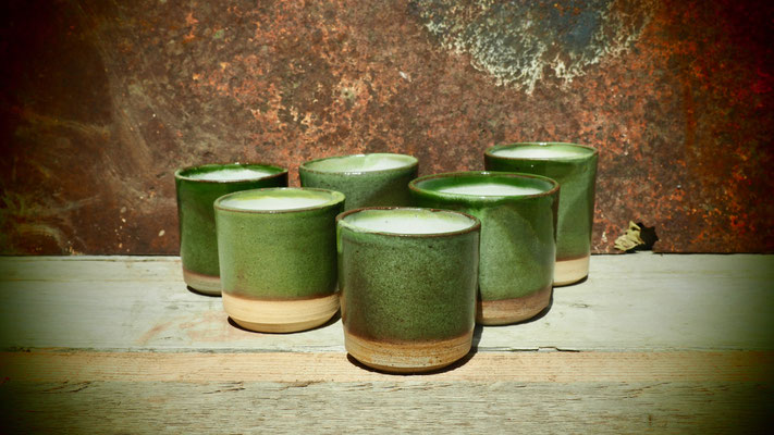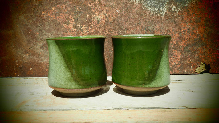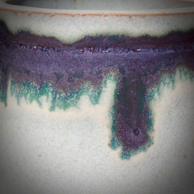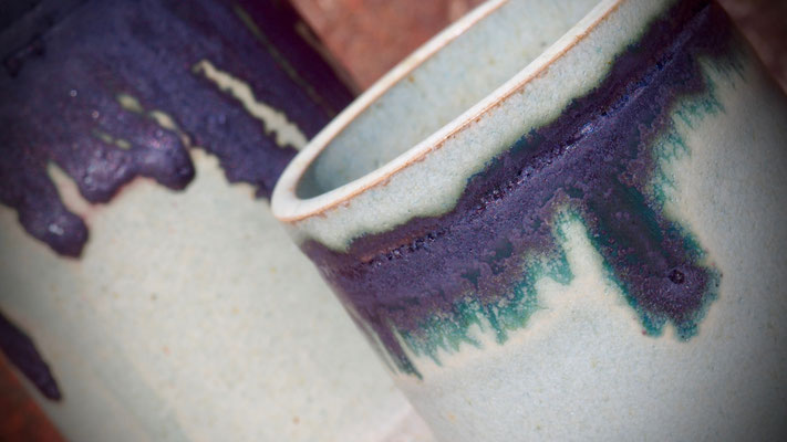 Surprise à l’ouverture du four le 7… Mon émail au cuivre et à la cendre de vigne, d’ordinaire vert pâle, est aussi rouge, lie de vin par endroits.