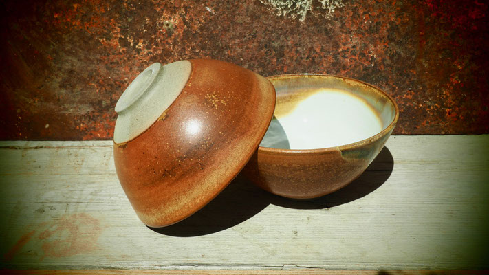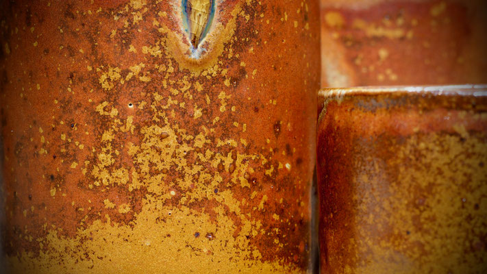 Je ne m’attendais absolument pas à ce rouge en ouvrant le four… Les pots montrent d’importants courants réducteurs, qui se sont parfois partagé entre les pièces, formant une tâche rouge qui relie